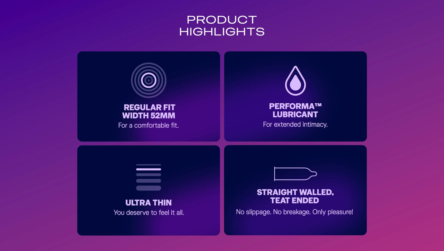 These condoms combine Performa Silicone Lubricant to help him last longer with an ultra-thin design for heightened sensations, giving her more sensational feels. Plus, they offer extra lubrication for a smoother, more enjoyable experience for both.