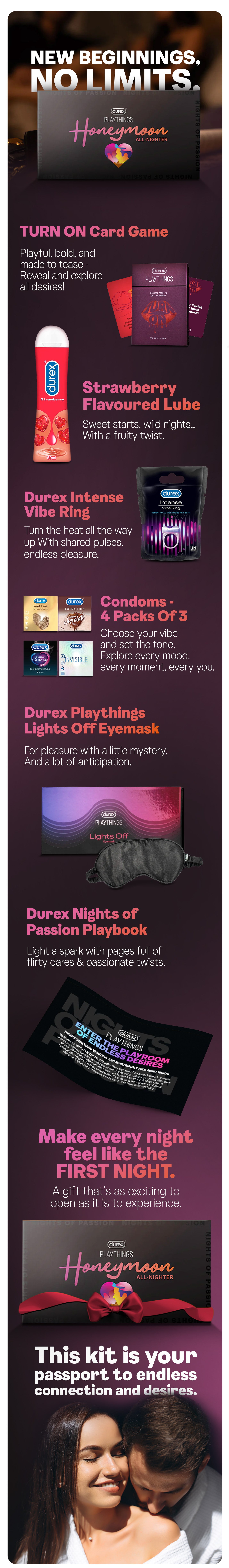 Durex Playthings Honeymoon All Nighter includes: Durex Playthings Nights of Passion Playbook, Durex Real Feel Condoms (Pack of 3), Durex Mutual Climax Condoms (Pack of 3), Durex Invisible Condoms (Pack of 3), Durex Chocolate Flavoured Condoms (Pack of 3), Durex Intense Vibe Ring, 1 Unit of Durex Strawberry Flavoured Lube, Durex Playthings O! Snap Card Game for Couples, Durex Playthings Lights Off Eye Mask.