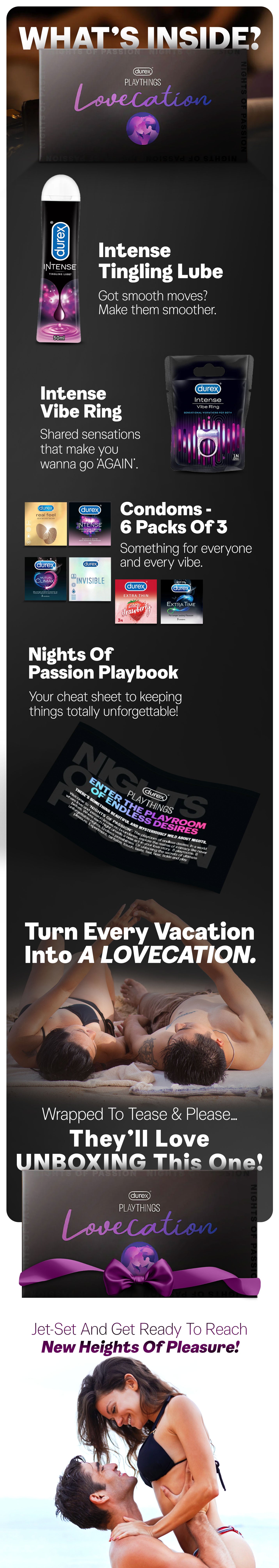 Durex Playthings Lovecation Playkit includes: Durex Playthings Nights of Passion Playbook, Durex Real Feel Condoms (Pack of 3), Durex Extra Time Condoms (Pack of 3), Durex Mutual Climax Condoms (Pack of 3), Durex Invisible Condoms (Pack of 3), Durex Intense Condoms (Pack of 3), 1 Unit of Durex Strawberry Flavoured Condoms (Pack of 3), Durex Intense Vibe Ring, Durex Intense Tingling Lube, Durex Playthings O! Snap Card Game for Couples
