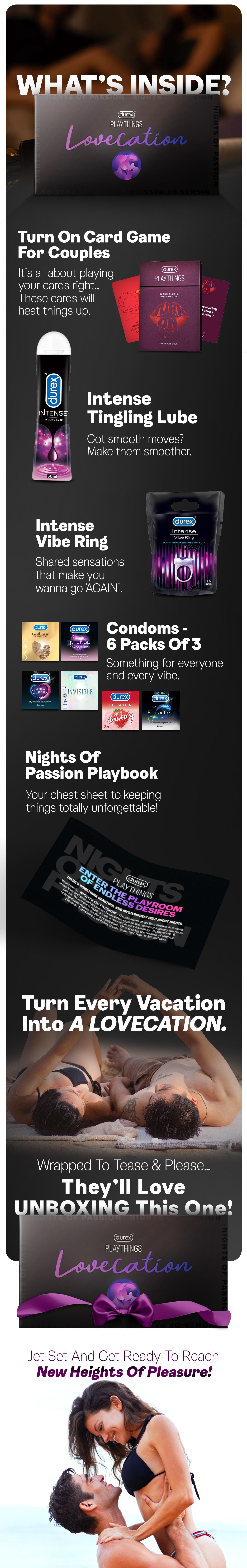 Durex Playthings Lovecation Playkit includes: Durex Playthings Nights of Passion Playbook, Durex Real Feel Condoms (Pack of 3), Durex Extra Time Condoms (Pack of 3), Durex Mutual Climax Condoms (Pack of 3), Durex Invisible Condoms (Pack of 3), Durex Intense Condoms (Pack of 3), 1 Unit of Durex Strawberry Flavoured Condoms (Pack of 3), Durex Intense Vibe Ring, Durex Intense Tingling Lube, Durex Playthings O! Snap Card Game for Couples