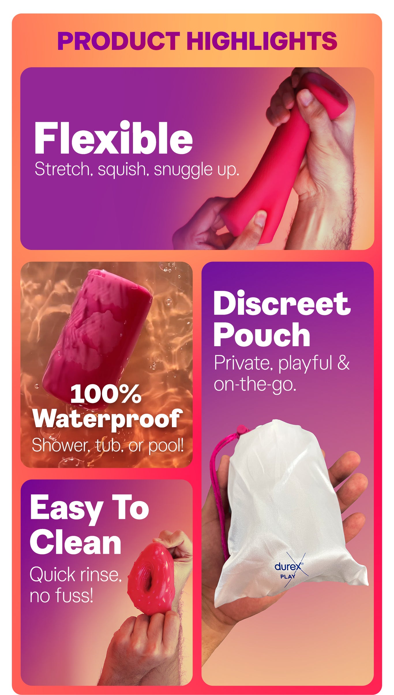 The sleeve is designed to be soft, stretchy, and textured, providing a realistic partner feel. It's also easy to clean and waterproof and has a discreet travel pouch for privacy.